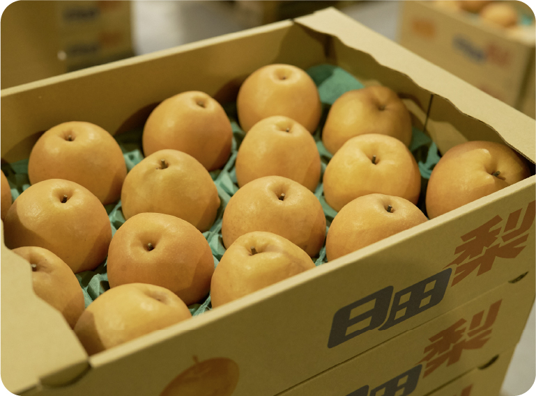 昼と夜、夏と冬の温度差が大きい盆地特有の気候、良質な水に恵まれた環境のもとで育った、甘くみずみずしい「日田の梨」。現在は、大分県を代表するブランドに成長しています。夏の「幸水」にはじまり、晩秋~冬の「晩三吉」「豊里(ほうり)」まで9品種(確認中)をリレーのように出荷。2004(平成16)年から海外への輸出がはじまり、現在は「新高」を中心に台湾、香港、タイ、ベトナムなどでも「日田の梨」が販売されています。