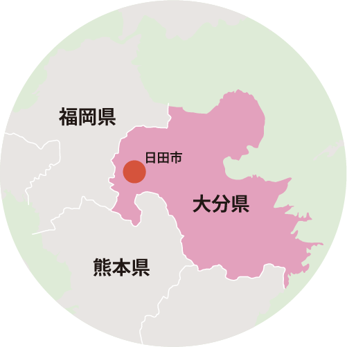九州のほぼ中央、大分県西部に位置する日田市。周囲を山々に囲まれた盆地であり、筑後川上流の三隈川が流れることから「水郷(すいきょう)」と呼ばれています。江戸時代に幕府の直轄地である「天領」として栄え、かつての面影を伝える町並みが今も豆田町(まめだまち)に残り、海外からも観光客が訪れています。市の面積の8割以上を林野が占め、「日田杉」の産地として有名ですが、豊かな自然と寒暖差の大きい盆地特有の気候を活かした果物や野菜の栽培も盛んです。